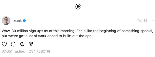 上线几个小时,扎克伯格就在 Threads 上庆祝,Threads 上已经涌入的 500 万注册用户,几小时后,这个数字变成了 3000 万。