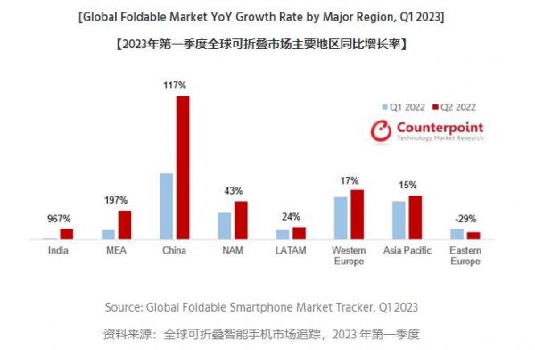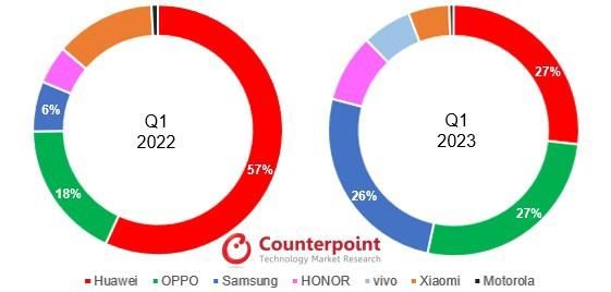 2023Q1中国可折叠手机出货量飙升117%:前三为华为、OPPO和三星