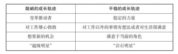 这种员工的成长轨迹十分陡峭,如果他们在一年内没有得到挑战的晋升,就会抓狂,觉得工作没意思。她把这种人叫作“超级明星”,他们是团队发展的动力。