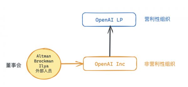 Altman 的第一段回答是,把研究和资本分开,拆成 2 个单体:一个非营利性组织,OpenAI Inc,人还是之前 OpenAI 的人,董事会控制知识产权、解决钱人算力的问题,部分人不持股比如 Altman;另一个营利性组织,OpenAI LP,负责和外部的财务投资和战略投资接洽。而非营利性 OpenAI Inc 控制这个营利性机构 OpenAI LP,靠卖它的股份融资。