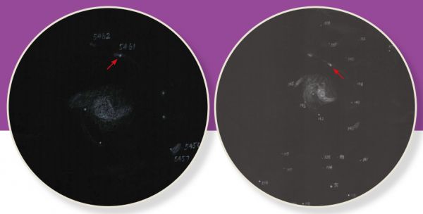 M101的超新星没有让我们失望,在我通过C14用35mm目镜看向它的第一眼,就判断出哪一颗是M101的超新星:一个亮点距离星系核6角分左右。第一,这个超新星很亮,在约36角分的视场范围内数它最明亮最显眼;第二,目镜中它的左侧紧靠着这个星系的一个小结节(后来查明是NGC 5461),这个小结节小而明亮,看起来颇为醒目。我对于M101星系的细节特征早已烂熟于心,所以能一眼确定这颗超新星。老乡同好在观察以后也感叹道:这颗超新星这么亮啊!