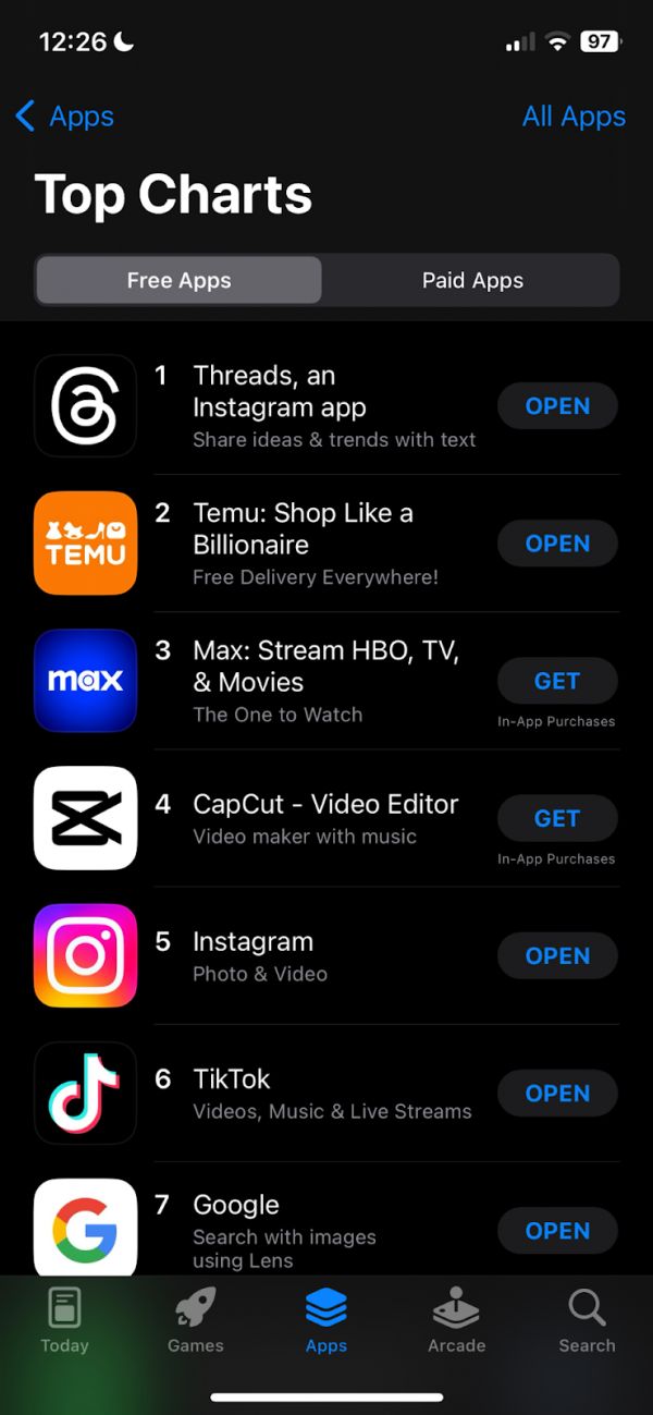 距离正式发布不到24小时,Threads应用已经在美国苹果应用商店的免费应用下载排行榜中蹿升到第一位。