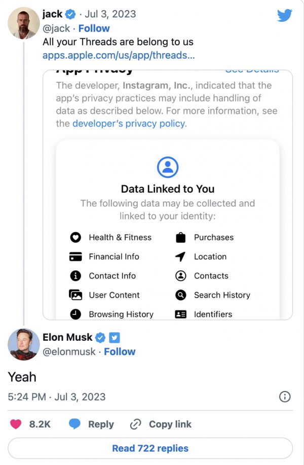 扎克伯格对Twitter发起的直接正面进攻,自然让Twitter背后的实际控制人马斯克坐不住了,在Threads上线之初就极尽各种嘲讽和不屑一顾。例如,Twitter原创始人Jack Dorsey在其个人Twitter上发布了一条Threads的产品说明截图,上面显示Threads可能收集用户各类数据,Dorsey评论称,“你的所有一切都是我的”。意思是Meta旗下的Threads还是走的那一套Meta社交应用的老路子,收集用户的各类个人数据。对此,马斯克回应“就是这样”。