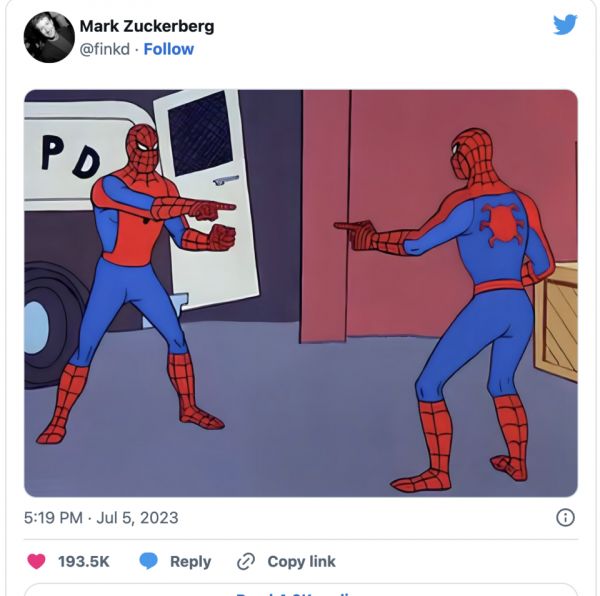 扎克伯格的兴奋之情隔着屏幕都能感受到。在被外界广泛看作是Twitter的竞品后,扎克伯格干脆也不藏着掖着了,破天荒在竞争对手Twitter平台上发了一条推文,图片是两个蜘蛛侠在互相指责对方是假的。
