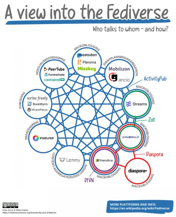 虽然基于Fediverse的各个服务器是独立运行的, 但服务器之间可以彼此互通。在不同的服务器(实例)上,用户可以创建不同帐号。这些帐号能够跨越实例边界进行通信,因为服务器上运行的软件支持一种或多种遵循开放标准的通信协议。