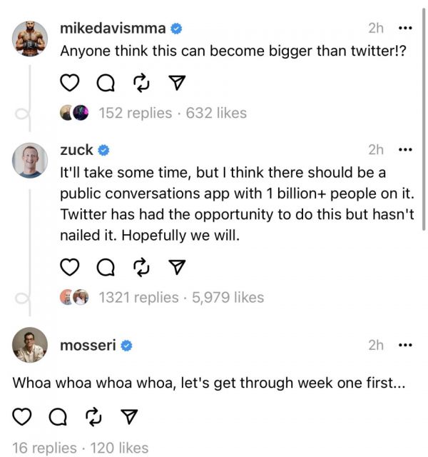对于Threads未来希望达成的目标,扎克伯格也公开明确地表达了自己的观点,那就是先达到10亿用户再说。在回答一位用户关于Threads是否会比Twitter更大时,他认为,“公共对话应用应该有10亿以上的人在这一平台上,Twitter曾有机会做到,但是没有做到,希望我们可以做到”。