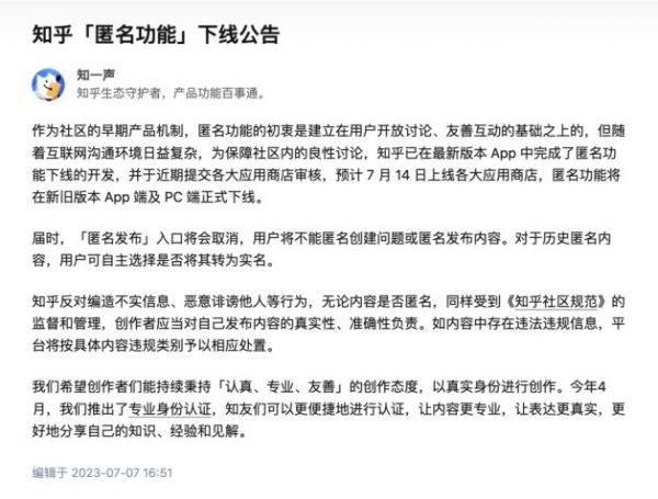7月7消息,知乎发布公告称,匿名功能将正式下线。此前,知乎创始人、董事长兼CEO周源曾在社交媒体表示,匿名功能是社区早期的产品机制,“知乎会做出改变”。