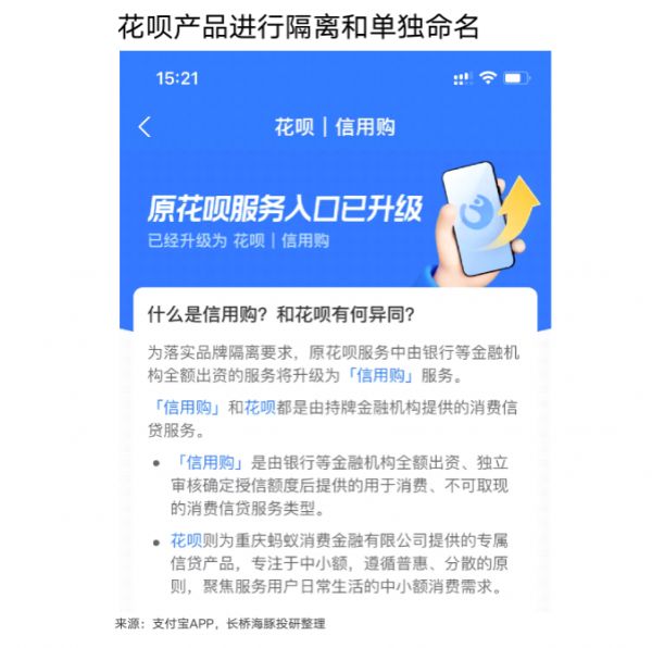 1.2 外部融资——信用购信用贷:为了解决支付宝消费贷中出资来源混乱的问题,由银行出资的部分,无论是助贷还是联合贷,已开始改名成“信用购”和“信用贷”,与由蚂蚁出资的“花呗”、“借呗”隔离。