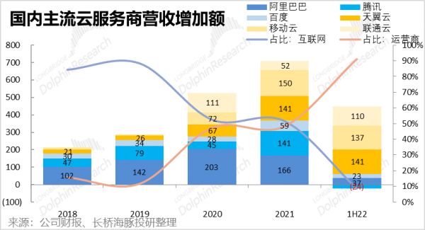 另外,从营收额同比绝对增量的角度,早在2020年电信运营商已基本和BAT平分秋色,而在2022上半年三大电信运营商的增量更是占据了总增量的90%。因此,运营商逐渐抢占云服务板块份额和增量的趋势是相当明确的。
