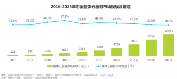 展望2023及以后,阿里和一众互联网公司的云服务增长表现会如何?从总量上,从互联网公司+运营商整体的当前增速和艾瑞对未来中期的预测,可以看到国内云服务未来的增速仍会保持在30%~40%的较高水平。