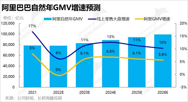 3. 基于我们对线上零售大盘11%的增速中枢预期,和直播电商对阿里的侵蚀将逐步消减的预期,海豚君预测2023自然年起阿里的GMV增速会回升并稳定在6%左右。