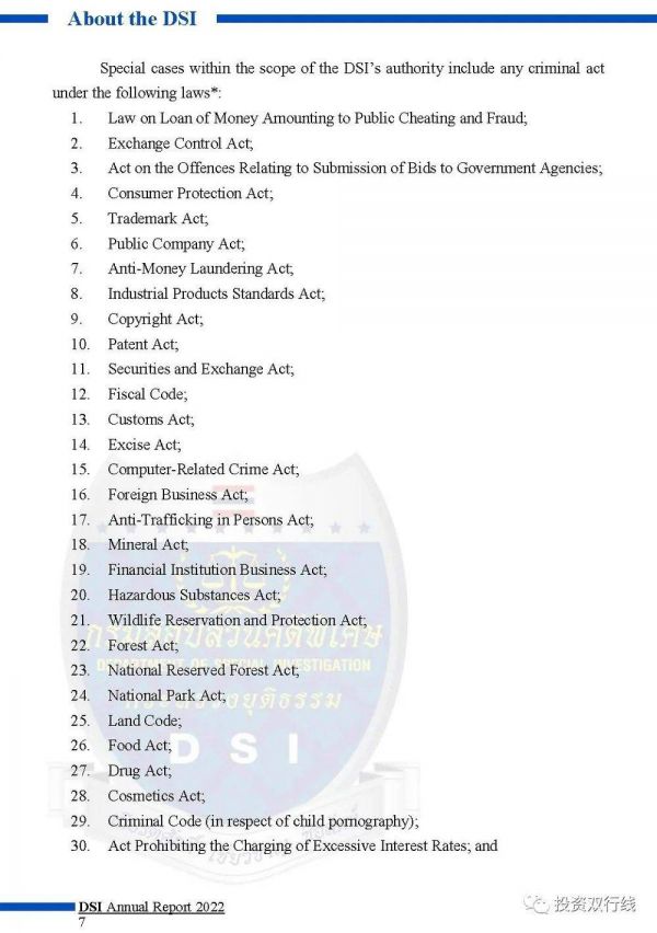DSI是隶属于泰国司法部的执法机关,职权范围是特殊刑事案件的预防、控制和调查。DSI负责涉及31部法律的犯罪案件的调查。这些法律就包括著名的《外商经营法》和《土地法典》。