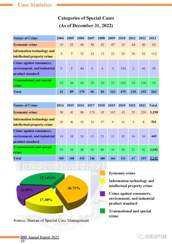 2004年至2022年,DSI共调查了3242起案件。2022年,DSI调查了315起案件,案件数量仅次于2010年。在全部案件中,经济类案件最多,占36.71%。其中,2022年的案件中,经济类案件就有250起,占79%。