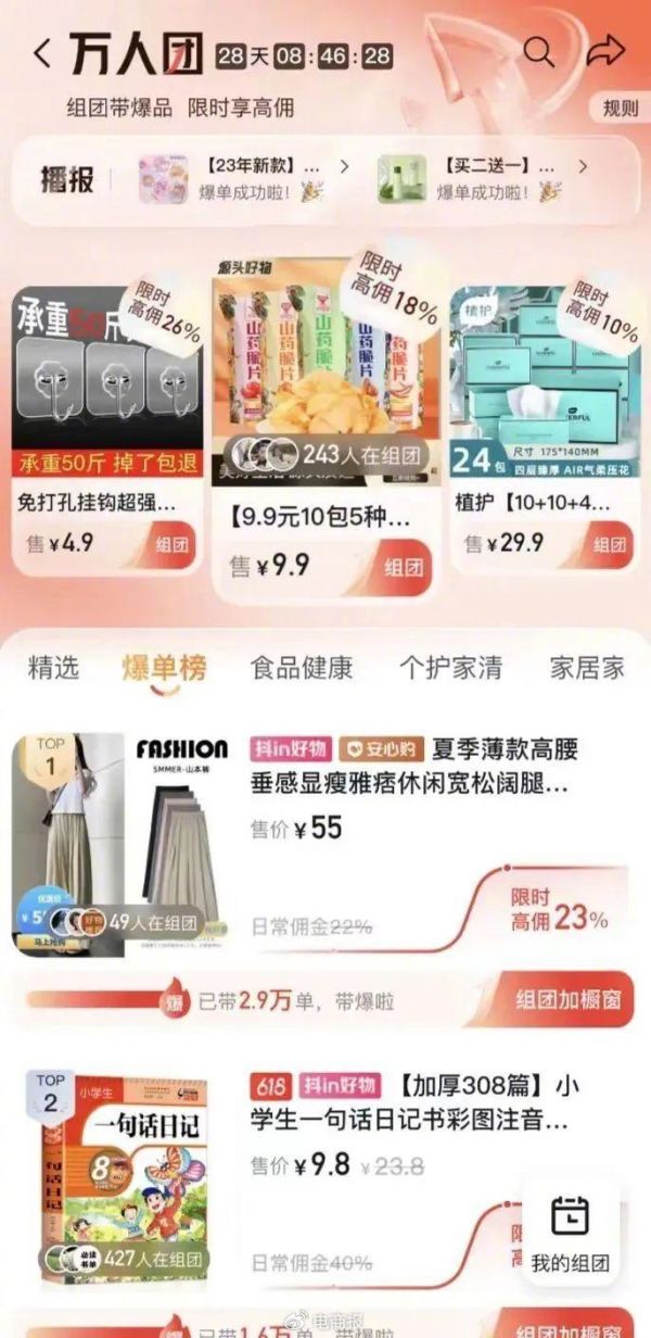如果说拼多多的拼团是“拼得多,省得多”,那么抖音的万人团则是“拼得多,赚得多”,同一商品的带货达人越多,佣金分成也越高。
