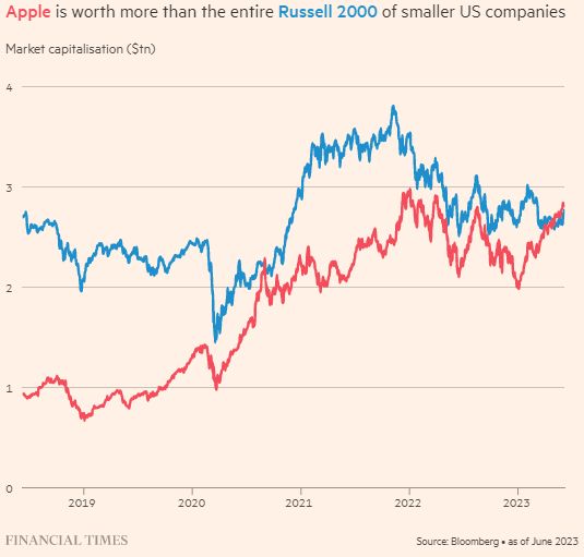 大型科技公司在该指数中占据了空前的权重。在这7家公司中,仅5家公司的股票几乎就占到整个标普500总市值的四分之一。按照2.9万亿美元的市值来看,仅苹果一家公司就超过英国上市公司100强的市值总和。
