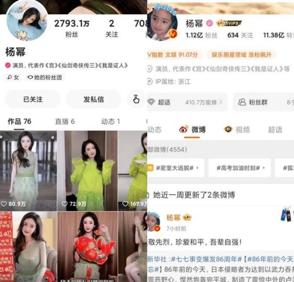以粉丝量为例,张雨绮在微博有1321多万粉丝,快手只有712万多;王祖蓝微博粉丝数4522万多,快手则只有2766万多;杨幂微博1.12亿粉丝,快手只有2793万多……