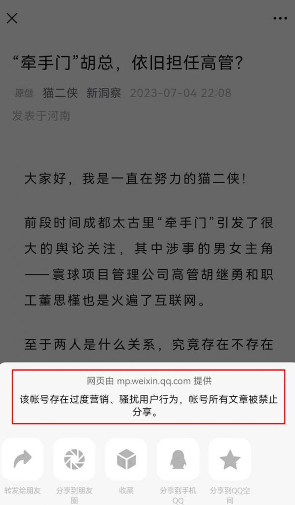 猫二侠发布“怒斥文章”后,微信撤销了其处罚,但公众号还是被封着。微信提示:该帐号存在过度营销、骚扰用户行为,帐号所有文章被禁止分享。