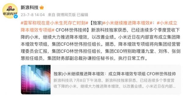 【品牌】曝小米成立降本增效专项组 雷军称现在是生死存亡时刻