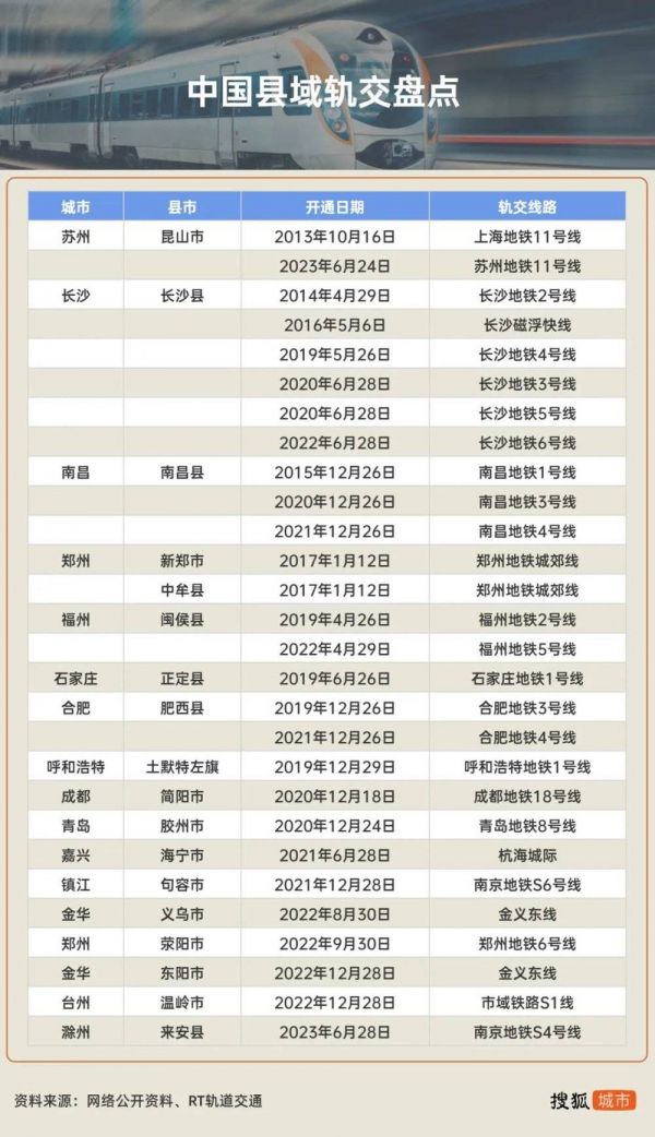 昆山之后,长沙市长沙县、南昌市南昌县以及郑州的新郑市、中牟县在5年内也纷纷迈入轨交时代。2014年,长沙开通的首条轨交线路便通达长沙县,此后几年又陆续开通了磁浮快线等5条线路,长沙县也因此成为全国通达轨交线路最多的县市。
