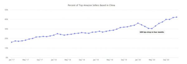 业绩增长和行业火热的双重利好下,亚马逊市值持续增长,成功跻身万亿美元俱乐部。平台和卖家也都开始了疯狂扩张。据悉,亚马逊2020年一年就增加了130万卖家,相当于每分钟增加两个,平台流量已经开始内卷。中国大卖占比达到42%,再创高峰。