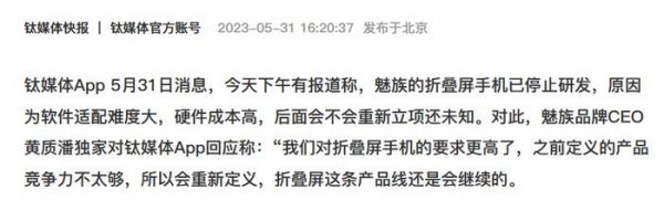 面对这一消息,魅族官方也是出面表示“我们对折叠屏手机的要求更高了,之前定义的产品竞争力不太够,所以会重新定义,折叠屏这条产品线还是会继续的。”也就是说,魅族之前确实有在试产折叠屏手机,但因为产品力不足以和市面上主流折叠屏手机竞争,因此直接推倒重做,后续会带来更好的魅族折叠屏产品。