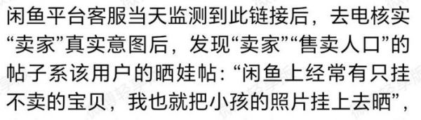 好了,让我们来揭开闲鱼平台上这起"人口买卖"事件的真相吧!首先,为什么会有这样的事情发生呢?原因之一是审核机制出现了“失误”,闲鱼是不是在掩盖“监管不力”呢?7月6日,多家媒体获悉的消息是,“卖孩子”只不过是个误会。