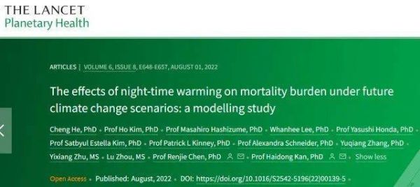 2022年8月,复旦大学联合首尔国立大学、东京大学等多国研究学者在《柳叶刀·星球健康》中发表了一篇研究论文。研究团队在分析了日本、韩国和中国的28个城市与夜晚高温相关的超900万人死亡情况之后发现,热夜的短期暴露与居民死亡之间存在显著的正向关联。