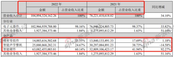 此前,歌尔股份披露的2022年年度报告中,公司虽实现营业收入同比增长34.10%,但净利润却同比减少59.08%。具体到业务层面,2022年歌尔智能声学整机业务同比增速为-14.58%,这与公司2022年11月8日发布公告,称“近日收到境外某大客户的通知暂停生产其一款智能声学整机产品”不无关系。