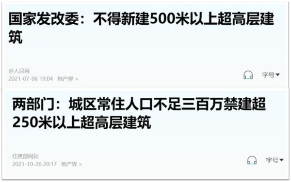 早在2020年,住建部、国家发改委联合发文,严格限制各地盲目规划建设超高层“摩天楼”,一般不得新建500米以上建筑。