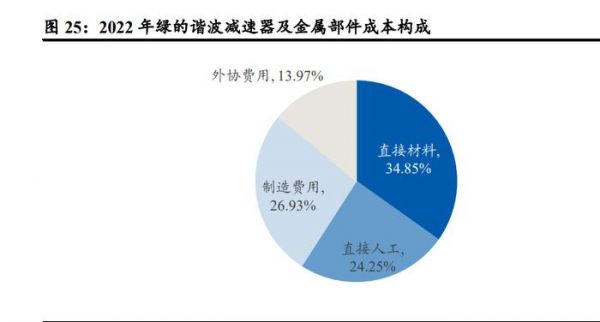 单位成本下降则主要得益于制造工艺进步以及规模效应提升,规格变化影响相对较 小。绿的谐波减速器成本构成包括:直接材料占比 34.85%、直接人工占比 24.25%、 制造费用占比 26.93%、外协费用占比 13.97%。从直接材料成本变化来看,2019 年 其小规格产品销量较 2018 年大幅提升,但材料成本变化不大,由此可知产品规格的 变化对成本端的影响相对较小。成本下降主要是得益于公司生产工艺进步及规模效 应带来的制造成本下降。而外协费用主要与需要外协制造的比重有关,若通过自建 产线生产则会相应增加人工费用和制造费用,因此影响也相对较小。