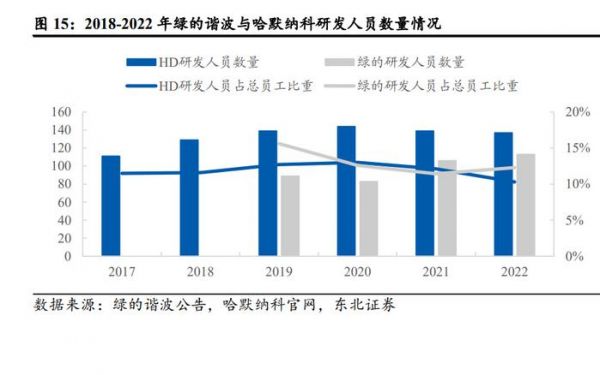 (3) 研发人员与研发投入方面:绿的谐波持续增加研发投入,研发人员数量从 2019 年的 89 人增加至 2022 年的 113 人,人员数量与人数占比已接近哈默 纳科。但受公司销售体量影响,研发投入规模仍与哈默纳科有较大差距,2022 年哈默纳科研发投入规模 6.38 亿元,而绿的研发投入规模仅为 4586 万。