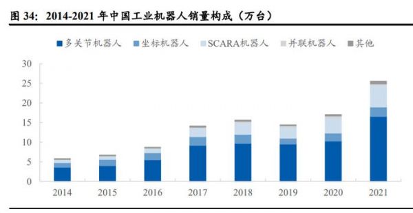 工业机器人是精密减速器最主要的下游应用领域。其中多关节机器人是国内销量最 高的机型,占到国内市场总销量的 60%以上,SCARA 机器人和坐标机器人销量排 名第二、三位。