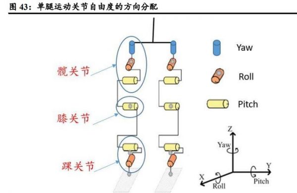 根据各个关节所处位置和相应的输出特征,我们判断特斯拉人形机器人使用 14 个 旋转关节和 14 个直线关节。特斯拉以所处位置和输出特征对 28 个执行器进行命名,分 yaw、pitch、roll 三种。欧拉角 yaw、pitch、roll 是表达旋转的一种方式,其反应 了载体相对基准面的姿态。以肩关节为例,roll 为翻转角,可对应到的动作为手掌的 翻覆;pitch 为绕俯仰角,可对应到的动作为手臂的上下摆动;yaw 为偏航角,可对 应到的动作为手臂左右摆动。我们根据关节位置及输出形式判断,特斯拉人形机器 人中:肩关节使用 3 个旋转执行器;轴关节使用 1 个线性执行器;腕关节使用 1 个 旋转执行器和 2 个线性执行器;髋关节使用 2 个旋转执行器和 1 个线性执行器;膝 关节使用 1 个线性执行器;踝关节使用 2 个线性执行器;躯干使用 2 个旋转执行器。
