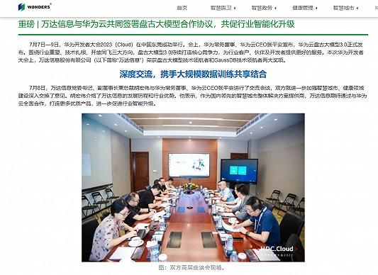 同日,在盘古大模型合作伙伴签约仪式上,万达信息与华为云签署盘古大模型合作协议,正式成为盘古大模型生态合作伙伴。