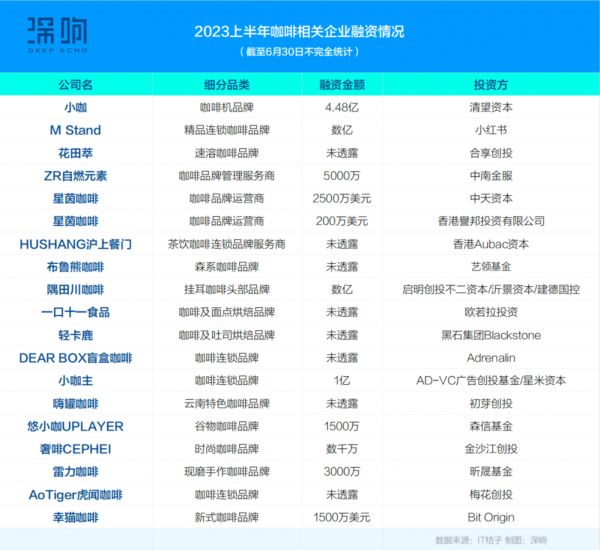 2023年上半年咖啡相关企业有19笔融资,相关融资不仅局限在品牌上,更是延伸到上游的咖啡机,咖啡机品牌小咖完成了4.48亿的融资,清望资本为投资方。值得注意的是连锁咖啡品牌M Stand获得了数亿元的B+轮融资,领投机构为小红书。
