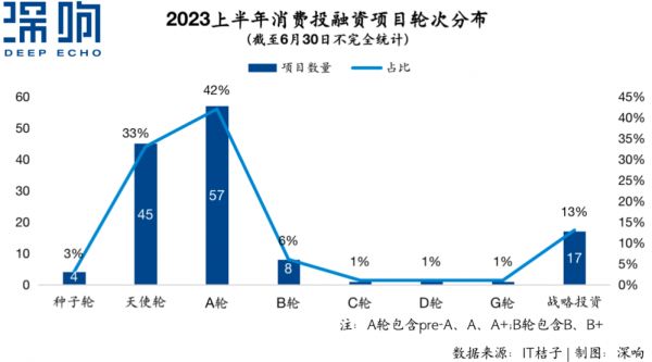 不难看出,2023年上半年消费行业投融资主要集中在天使轮和A轮,从金额看,在千万区间的投融资占比最高。