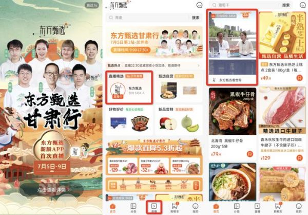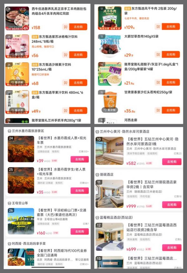 三个直播入口7月5日的这场“甘肃行”直播,在抖音、东方甄选APP同步进行。APP的直播产品界面几乎照搬了抖音,直播内容完全一致,但选品不同——抖音平台以酒店、跟团游为主,决策重、单价高。而消费频次高、价格门槛低的农产品,悉数被搬到了东方甄选APP。