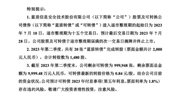 蓝盾退公告显示,截至2023 年第二季度末,蓝盾转债尚有9999.48万元的剩余票面金额,其称,结合公司目前的资金状况,公司预计可转债2023年付息事项(第五年利息,票面利率为1.8%)存在违约风险。