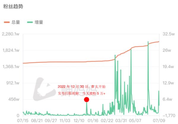 诸如此类,冲突越激烈的视频,播放量越高,涨粉也就越快,蝉妈妈数据显示,该视频发布第二天,B太账号涨粉30万。
