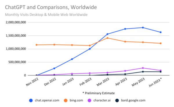 根据网站数据分析工具 SimilarWeb 最新调查显示,在刚刚过去的 6 月中,ChatGPT 网站的全球流量下降了 10%——这是 ChatGPT 自去年 11 月推出以来,首次出现访问数量下降的情况。
