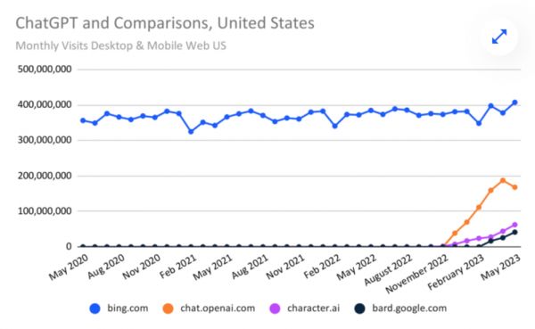 据 SimilarWeb 初步估计,ChatGPT 网站(chat.openai.com)的全球桌面和移动网络流量从 5 月到 6 月共下降了 9.7%,另外微软搜索引擎 Bing 的全球流量除了 3 月因引入 Bing Chat 有明显提升后,近三个月也在逐渐减少: