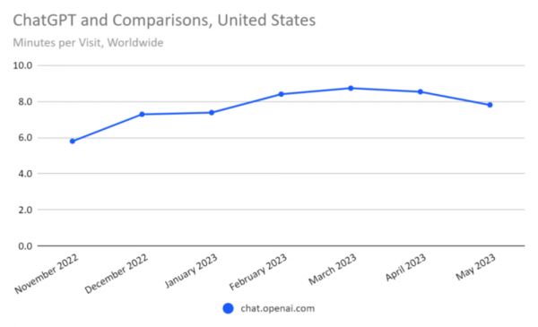 除了访问量增长率出现负增长,SimilarWeb 指出用户对 ChatGPT 的访问时间也在减少:“从每次访问的时间来看,ChatGPT 的访客参与度也在下降。目前我们还没有六月份的这一指标,但五月份已经下降了 8.5%。”