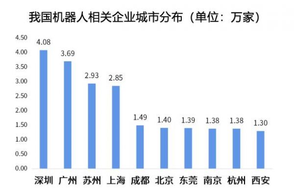 从各地产业密度来看,东部仍是机器人产业发展的高地。数据显示,截至6月末,深圳、广州、苏州分别有机器人相关企业4.08万家、3.69万家、2.93万家,排名前三,此后依次为上海、成都、北京、东莞等城市。