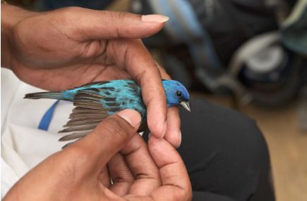 一位科学家正在给这只靛蓝彩鹀 (Passerina cyanea) 做体态测量及标记前的准备。这项工作是鸟类种群研究所正在进行的监测工作的一部分。