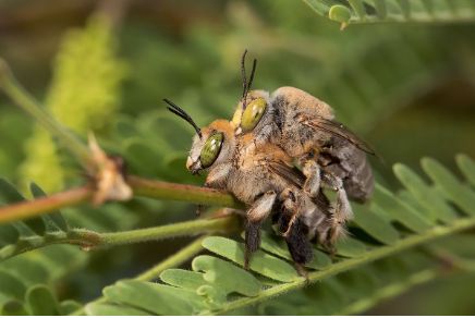 一只小号雄性挖掘蜂正在豆科灌木(Prosopis)上与一只雌蜂交配。