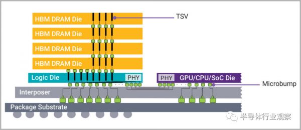 HBM应运而生,前面提到了GDDR陷入到了内存带宽和功耗控制的瓶颈,而HBM的思路,就是用TSV技术打造立体堆栈式的显存颗粒,让“平房”进化为“楼房”,同时通过硅中介层,让显存连接至GPU核心,并封装在一起,完成显存位宽和传输速度的提升,可谓是一举两得。