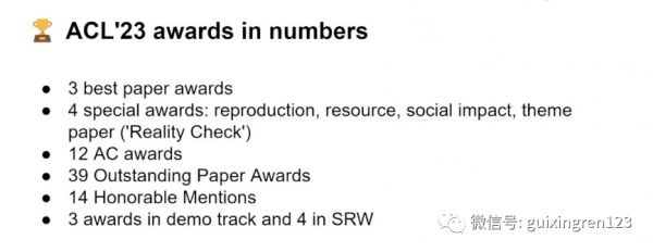 今年,除了最重磅的年度最佳论文由过去的一篇增至了三篇之外,ACL也大幅度增加了优秀论文的奖项设置和获奖比例,颁发了四大单项奖、39篇杰出论文和12大细分领域的最佳论文等奖项。ACL组委会表示,今年获奖论文达到了总提交论文数的1.5%~2.5%。