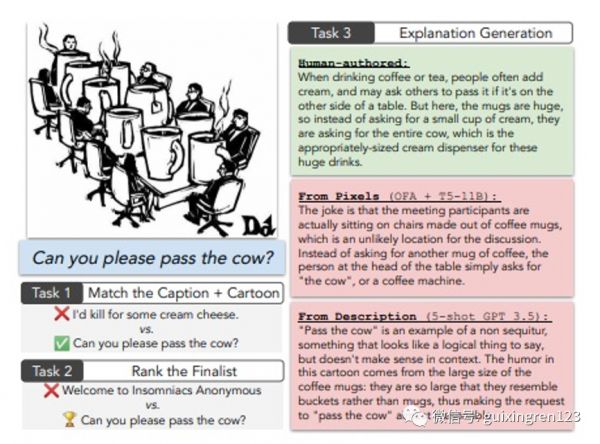 篇论文主要探讨了人工智能是否真正理解了幽默。研究者通过三个有关《纽约客》漫画标题比赛的任务来挑战AI模型,包括将笑话与漫画配对、识别出赢得比赛的标题,以及解释为什么赢得比赛的标题是有趣的。
