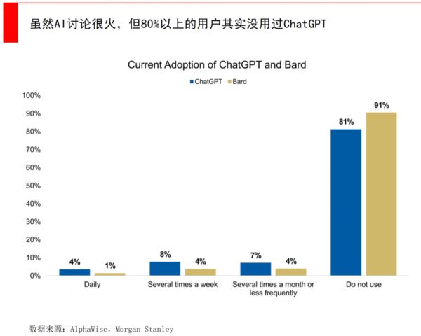 大家发现这两个数字的对比,有意思在哪里了吗?显然,摩根士丹利调研的群体,大概率就是在这一轮热潮中讨论过、分享、演讲、提到过AI的那群人。而这不是个例,现实世界的情况,应该和这组数字对比的体感差不多,一面是大家都在谈论AI,另一面是真正用过AI产品的人不多。