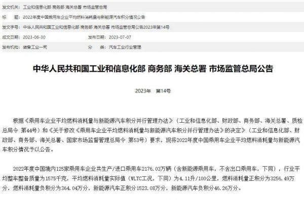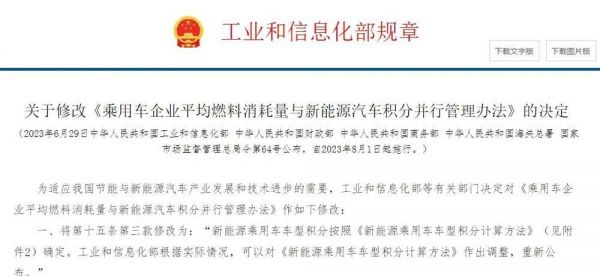 日前,工信部等部门联合发布的《关于修改〈乘用车企业平均燃料消耗量与新能源汽车积分并行管理办法〉的决定》(以下简称《决定》)明确,对现行《乘用车企业平均燃料消耗量与新能源汽车积分并行管理办法》进行修改,自2023年8月1日起施行。